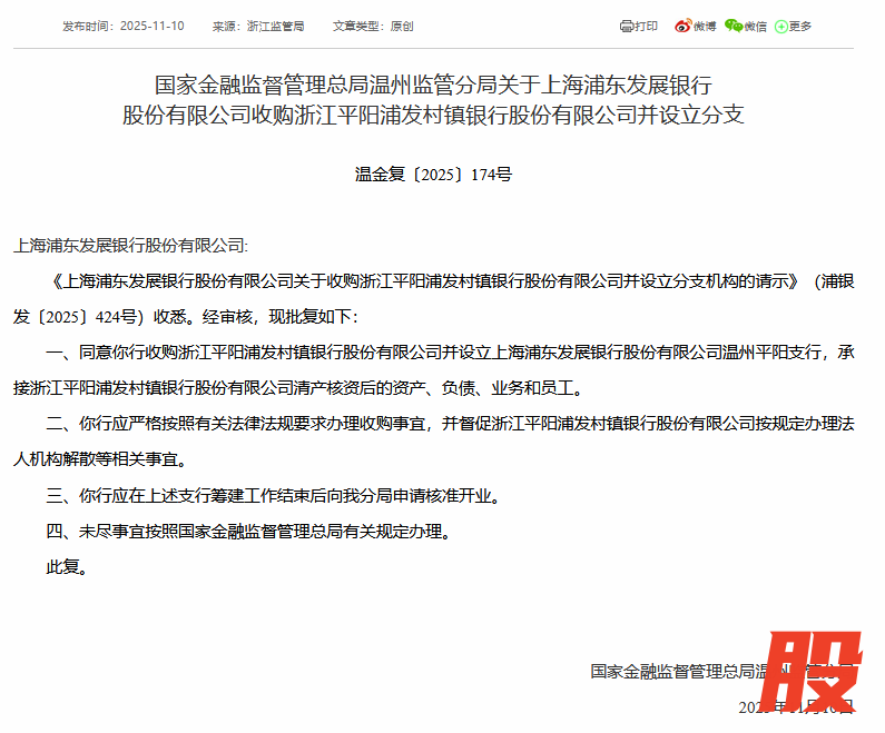 11月10日金融一线消息,国家金融监督管理总局温州监管分局今日发布《关于上海浦东发展银行股份有限公司收购浙江平阳浦发村镇银行股份有限公司并设立分支》的批复,同意浦发银行收购浙江平阳浦发村镇银行股份有限公司并设立上海浦东发展银行股份有限公司温州平阳支行,承接浙江平阳浦发村镇银行股份有限公司清产核资后的资产、负债、业务和员工。